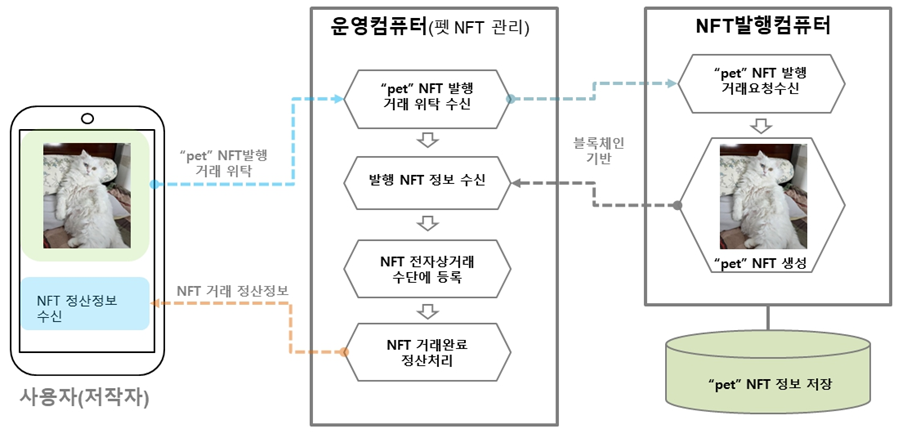 반려동물(PET)의 사진 등의 저작자 또는 창작자인 사용자가 사용하는 사용자단말기에서 펫 저작물을 입력하고 NFT 발행 및 거래를 위탁하면 운영컴퓨터가 수신하여, 블록체인 기반으로 운용되고 있는 NFT 발행컴퓨터에 해당 펫 저작물을 전송하여 NFT 발행을 요청하고, NFT 발행컴퓨터는 펫 저작물에 관한 NFT를 생성하여 블록체인 기반에 저장시킴과 동시에 운영컴퓨터로 발행된 NFT 정보를 전송, 운영컴퓨터는 발행된 NFT 정보를 전자상거래 수단에 등록시켜 거래에 노출, 거래 완료되면 사용자단말기에 NFT 거래 및 정산 정보를 전송하는 발명 - 대리인: 변리사 이종일 -