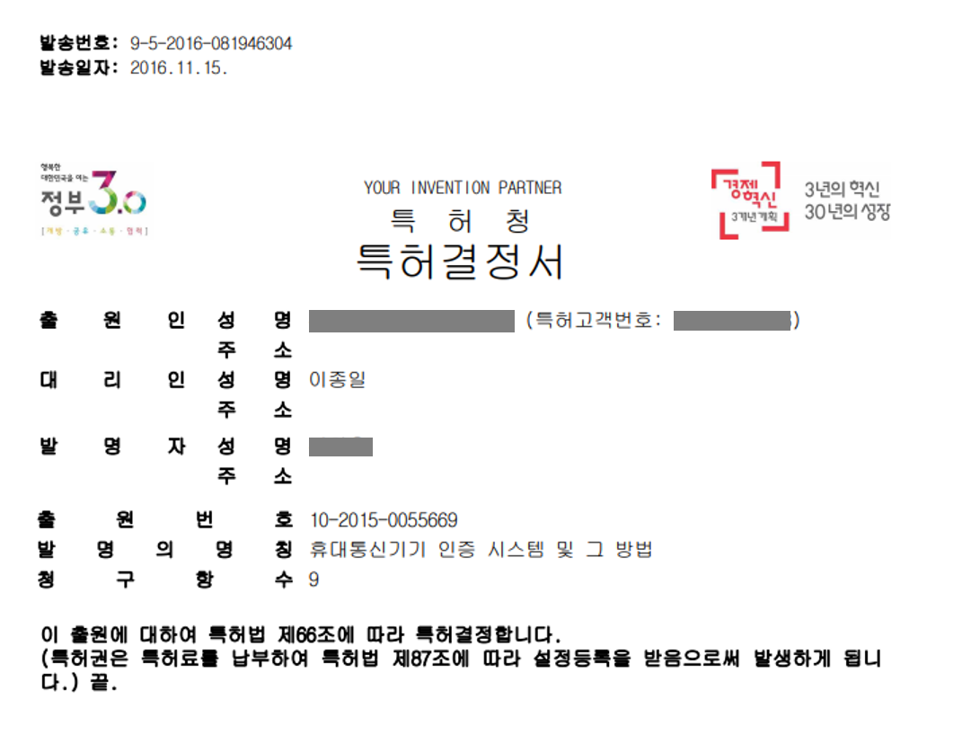 이종일 변리사를 통해 등록 되었된 휴대통신기기 인증/보안 기술 관련 BM특허를 소개합니다.