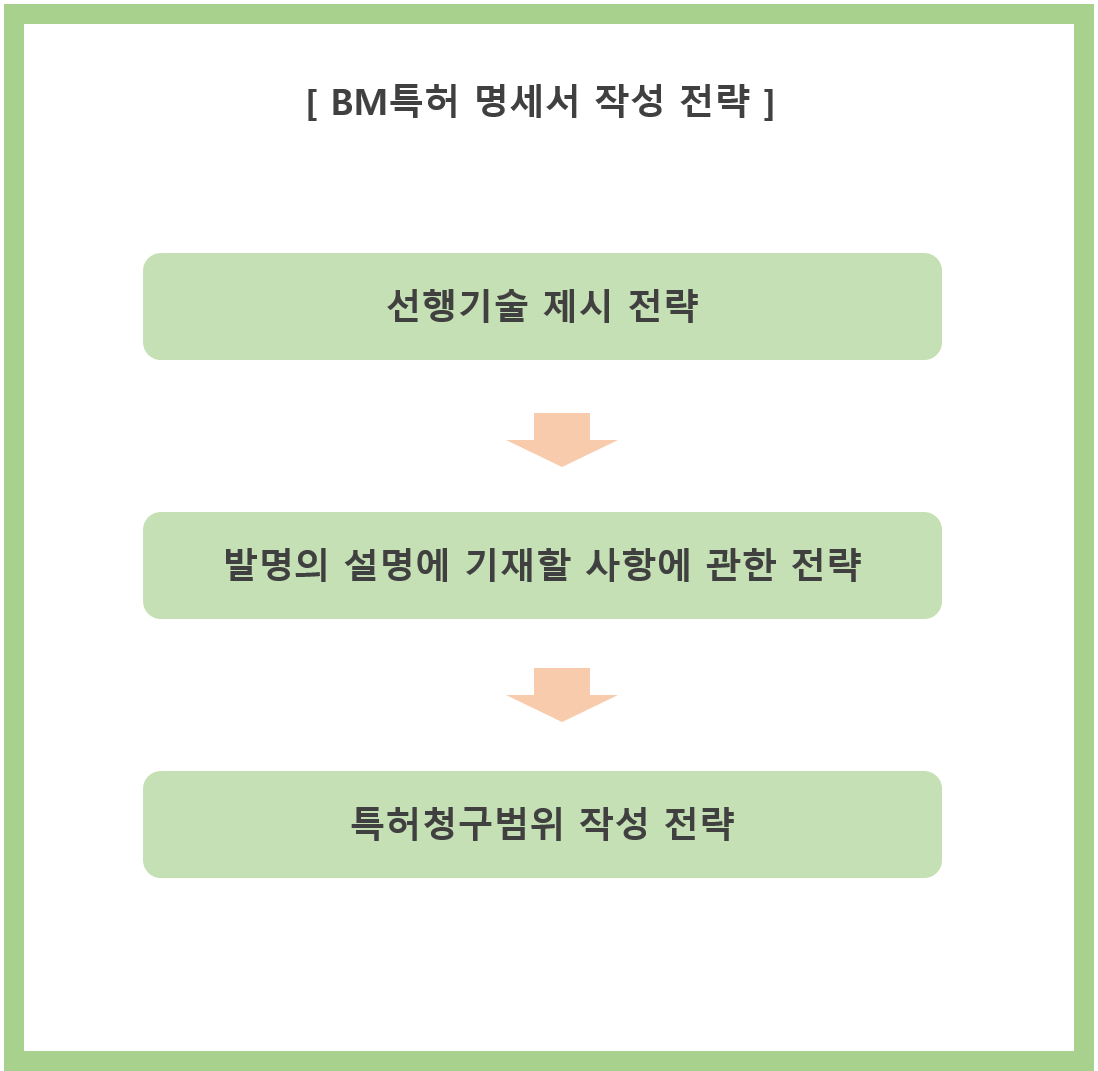 아울러, BM특허 등록을 받기 위해 심사관과의 공방(거절이유 대응 등)을 염두에 두고 심사관의 심사 판단에 유리한 결과를 가져올 수 있도록 작성해야 합니다.